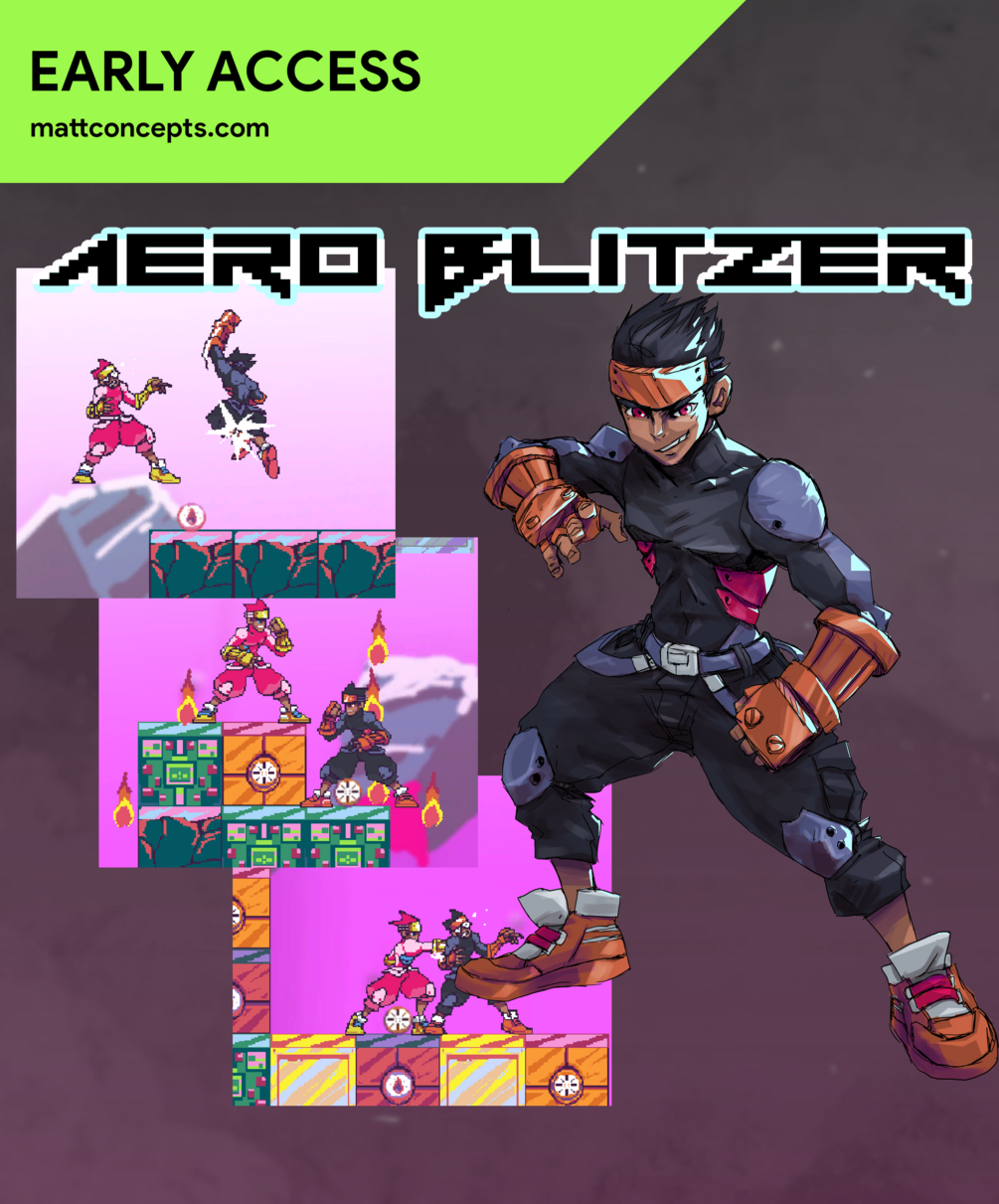 Aero Blitzer is a platform fighter in a destructible world. Fighters can bash, throw items and crash into the platforms to minimalise land to fight on. Punch your friends into submission but don't fall to your death!